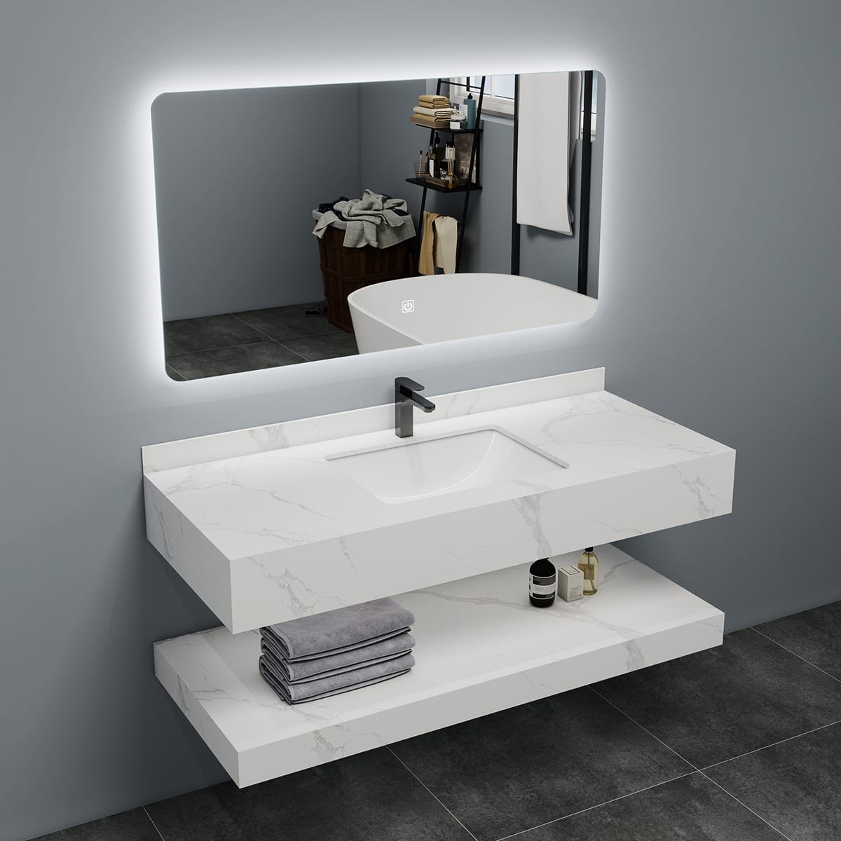 The WonderStone Bathroom Cabinet is a versatile wall-mounted vanity designed for elegance and functionality. Its double-layer marble countertop and integrated ceramic basin provide ample workspace and storage for everyday bathroom essentials.